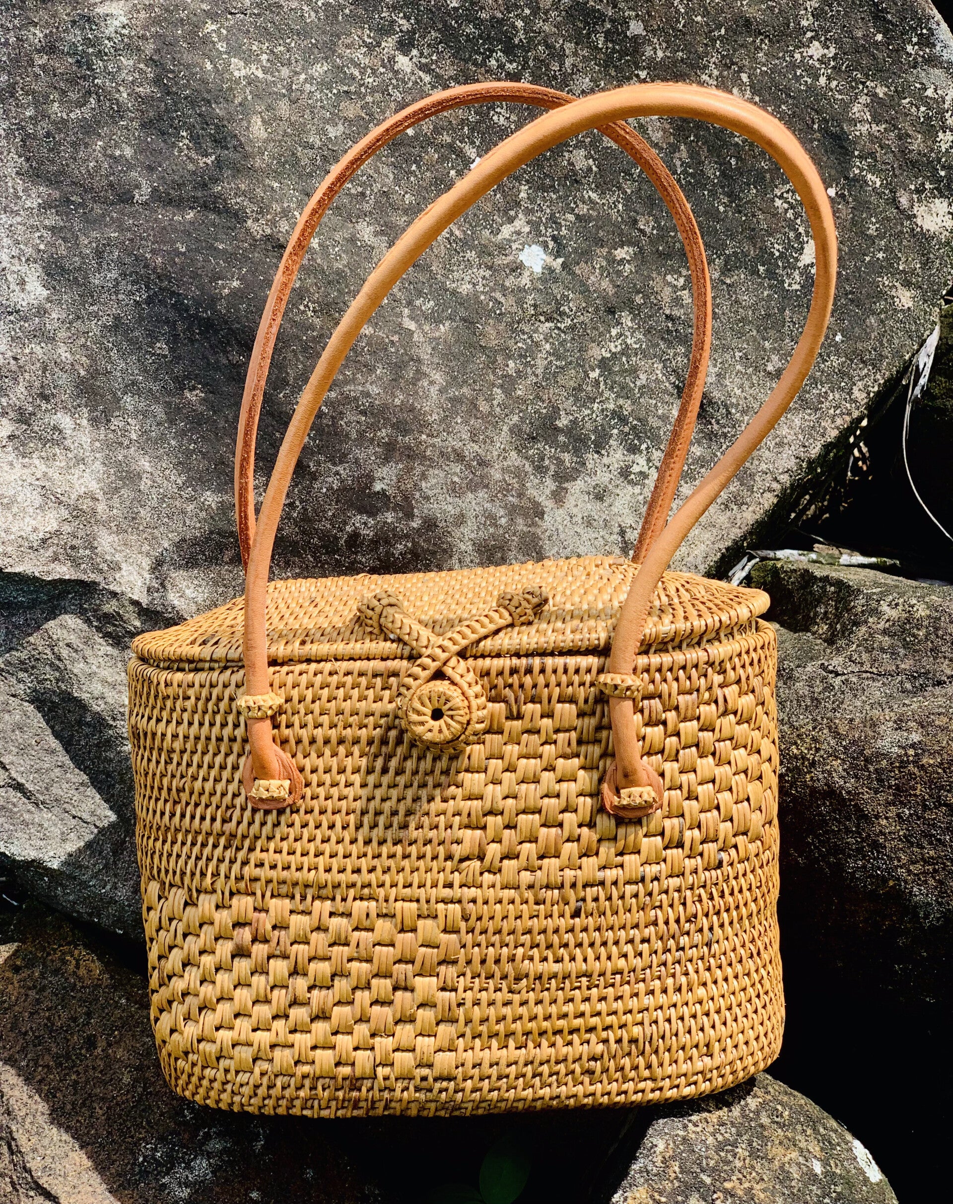 Handmade oval rattan bag with leather strap. Rattan crossover fastener.